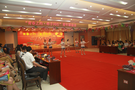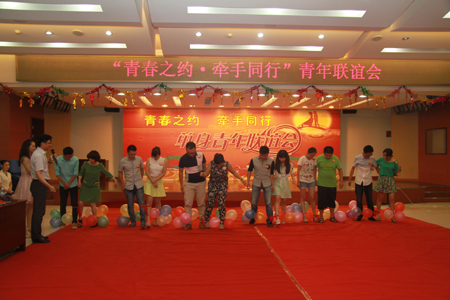 8月9日下午,市人民医院举办单身青年联谊会,全市有9家单位的120余名未婚青年参加此次联谊活动,10对青年现场牵手成功。图为青年们玩“踩气球”游戏。